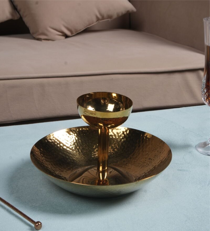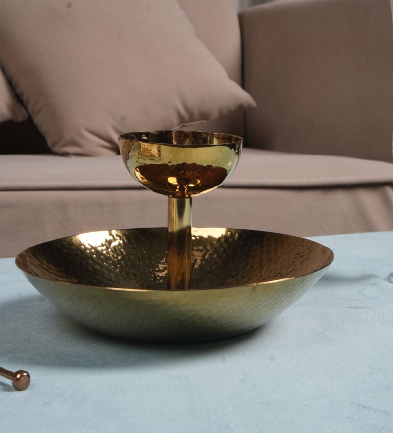 This chip n dip bowl (set of 2) from Sage Koncpt has an elegant design . The chip n dip bowl can be used to keep fruits or snacks, and can also be used as a key bowl or decor item. The bowls are made of stainless steel, have a gold finish .