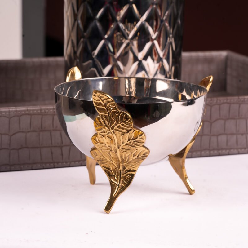 Make a bold style statement with this luxurious decorative metal bowl, crafted to elevate any space with its regal charm. Featuring a mirror-finish silver bowl supported by intricately designed gold-finish legs, this piece beautifully blends classic elegance with modern luxury.
