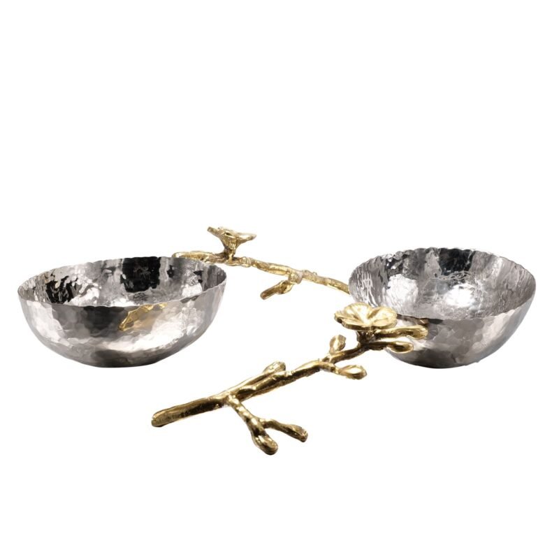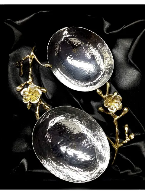 Add artistic elegance to your serving collection with this exquisite dual hammered bowl set, thoughtfully designed with a striking contrast of silver-finish bowls and gold-tone floral handles. The organically hammered texture gives each bowl a unique, handcrafted appeal, while the decorative branch-and-flower handles elevate it into a statement serveware piece.