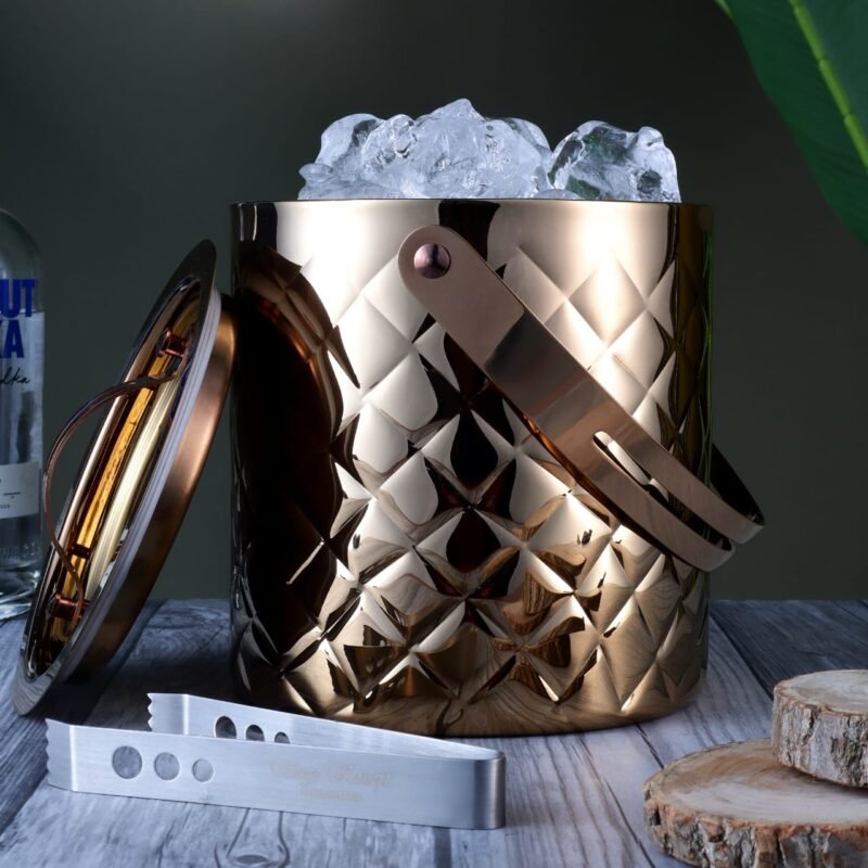 Add a touch of modern elegance to your bar setup with this luxury rose gold stainless steel ice bucket. Featuring a sophisticated diamond-cut textured design and a warm rose gold finish, this ice bucket brings a refined, contemporary charm to any party or home bar. Crafted from high-quality stainless steel, it is designed to keep ice cubes chilled for longer while offering durability and long-lasting shine.