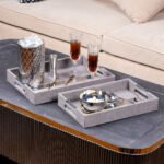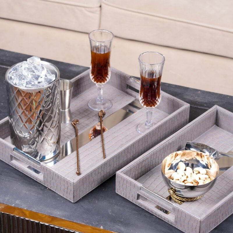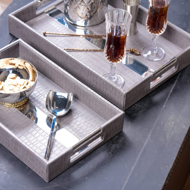Upgrade your hosting experience with this premium rectangular serving tray, designed in a sophisticated grey faux-leather finish with a reflective mirror base. Perfectly blending style and functionality, this tray adds a modern luxury touch to any space. A thoughtful gift for housewarmings, weddings, anniversaries, festive celebrations, and corporate gifting.