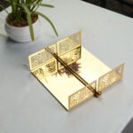 Elevate your table setting with this luxurious gold metal napkin holder, designed with an elegant cutwork pattern and a refined polished finish. The artistic panel design adds a sophisticated decorative touch while securely holding napkins in place. A central metal rod with a rounded finial ensures stability and easy access during use.