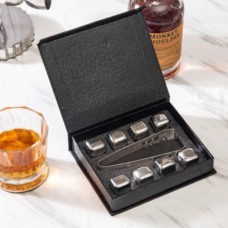 Crafted from high-quality, food-grade stainless steel, these reusable chilling stones cool your drink quickly and evenly. The set comes neatly packed in a luxurious black storage box and includes stainless steel tongs for hygienic handling, making it ideal for both personal use and gifting.