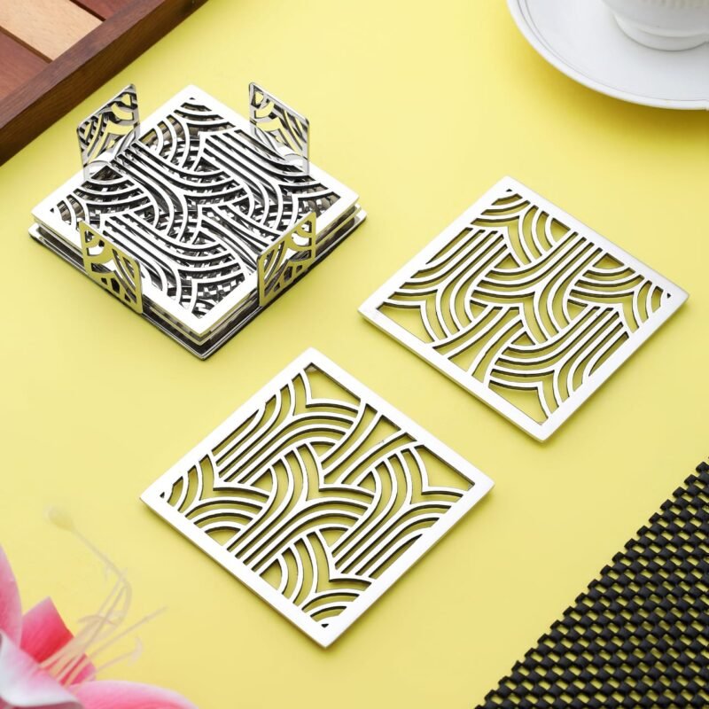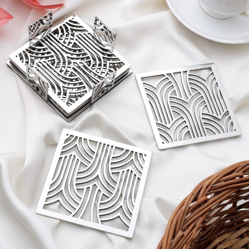 Enhance your table setting with this premium silver colour decorative metal coaster set. Featuring an artistic geometric cutwork design, these coasters add a refined and modern touch while protecting your surfaces from heat, stains, and moisture.