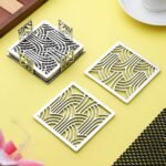 Crafted from high-quality, rust-resistant metal with a polished silver finish, each coaster is durable, sturdy, and easy to clean. The matching metal holder keeps the coasters neatly organised and adds to the overall aesthetic appeal.