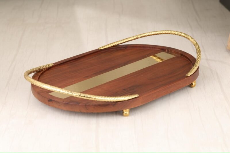 Serve in style with this elegant wooden serving tray, designed to bring warmth and sophistication to your table décor. Crafted with a rich wood-finish base and accented by sleek gold-tone metal handles, this tray perfectly balances natural charm with modern luxury. The raised edges and sturdy feet provide stability, making it ideal for both serving and display.